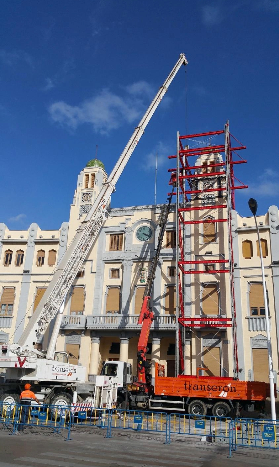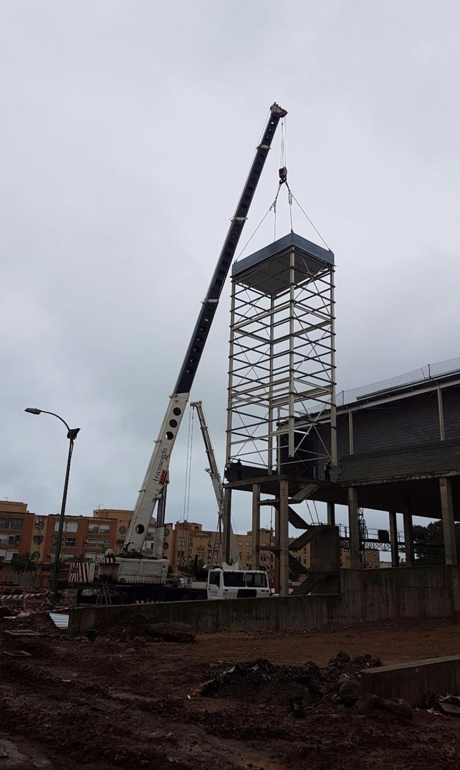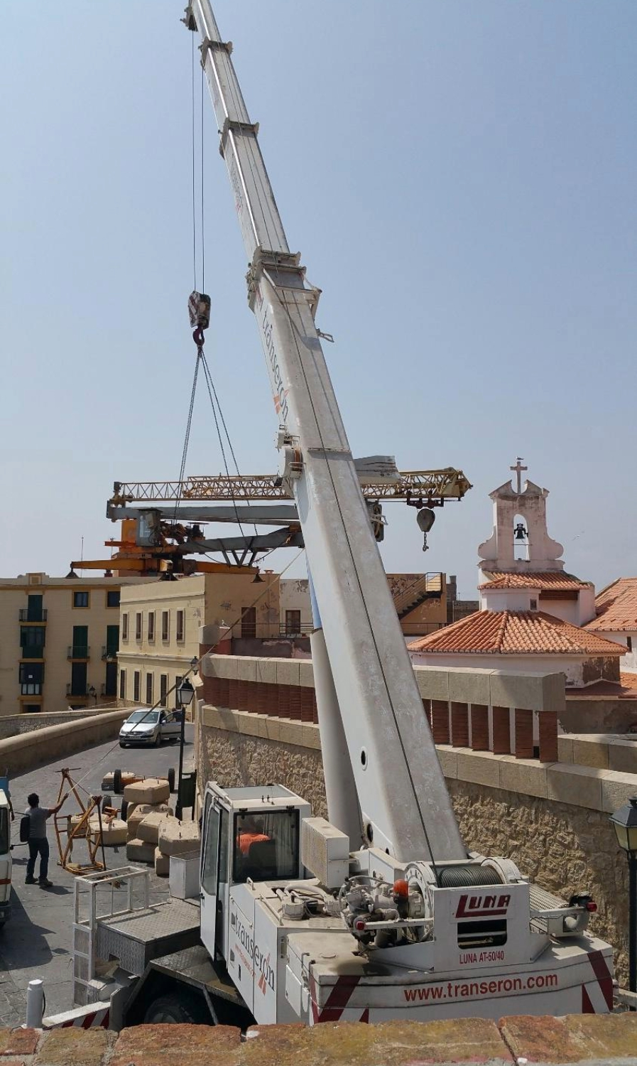 Montaje de grúa automontante en el patio de la iglesia de Melilla La Vieja