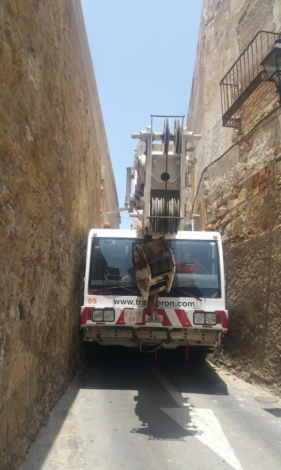 Grúa de 50 TN pasando por la carretera más estrecha de Melilla
